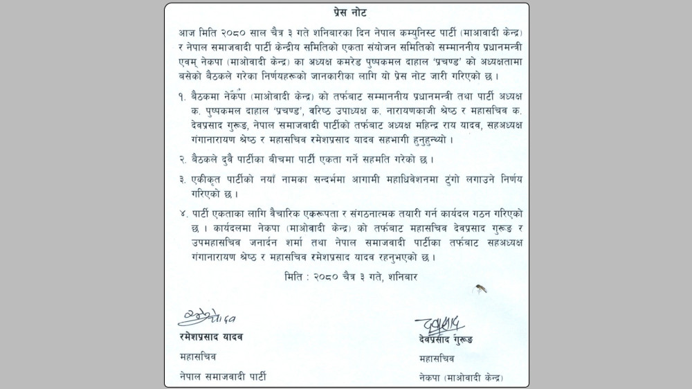 काठमाडौँ । नेकपा (माओवादी केन्द्र) र नेपाल समाजवादी पार्टी (नेसपा)बीच पार्टी एकता गर्ने सहमति भएको छ ।