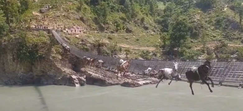 अछाममा झोलुङ्गे पुल चुडियर पुलमा हिँडिरहेका खच्चड च्यापिएका छन् ।