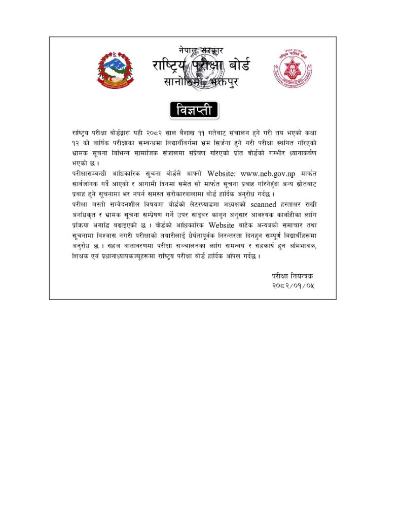 सामाजिक सञ्जालमा परीक्षा सरेकाे भन्ने भ्रामक सूचना आएपछि बोर्ड विज्ञप्ति नै जारी गरेकाे हाे। ‘यही २०८२ साल वैशाख ११ गतेवाट संचालन हुने गरी तय भएको कक्षा १२ को वार्षिक परीक्षाका सम्बन्धमा विद्यार्थीवर्गमा भ्रम सिर्जना हुने गरी परीक्षा स्थगित गरिएको भ्रामक सूचना विभिन्न सामाजिक संजालमा संप्रेषण गरिएको प्रति बोर्डको गम्भीर ध्यानाकर्षण भएको छ,’ विज्ञप्तिमा भनिएको छ।