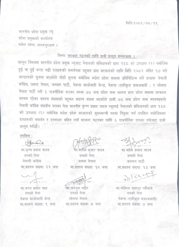 आज दिउँसो बसेको ६ दलका नेताको बैठकमा कांग्रेसलाई मुख्यमन्त्री दिने सहमति भएको थियो। लोकतान्त्रिक समाजवादी पार्टी (लोसपा) ले मुख्यमन्त्रीमा दाबी छोडेपछि कांग्रेसका यादवको नाममा सहमति जुटेको हो।