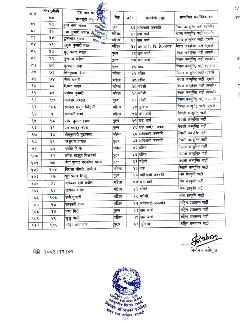 दलहरूले यसअघि निर्वाचन समानुपातिक बन्दसूचीबाट आइतबार नाम सिफारिस गरेका थिए। दलहरूले बुझाएको सूचीमा कलस्टरसम्बन्धी समस्या नदेखिएपछि आयोगले नाम रूजु गरेर निर्वाचित गरेको हो।